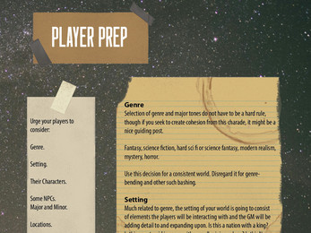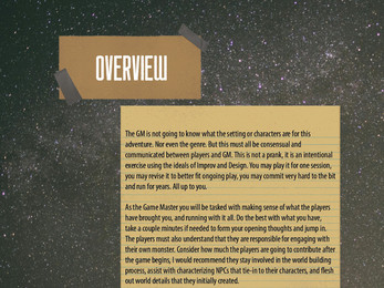 It is an experiment, an exercise, in which the Game Master does no prep. Everything must be prepared by the players. The process I recommend is contained within. It favors a minimal approach.